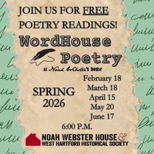 WordHouse Poetry is a monthly series of free poetry readings at the Noah Webster House. Readings occur once a month on select Wednesdays from 6:00 pm – 8:00 pm. Join host James Finnegan, West Hartford’s third Poet Laureate, for an evening of poetry at the National Historic Landmark home of Noah Webster! Each program begins with an open mic and features two headlining poets. No registration is required and donations are greatly appreciated to support the not-for-profit museum. See below for information on future readings.